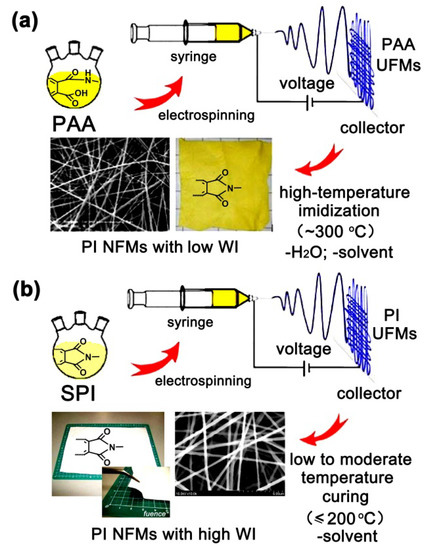 In view of the origination of the poor whiteness of conventional electrospun PI UFMs, various modification works have been performed in the literature. Up until now, most of the works have focused on two pathways. The first is to prohibit the high-temperature oxidation or yellowing of the PI UFMs via developing preimidized PI resins as the starting materials for the fabrication of PI UFMs, as illustrated in Figure 1. Soluble PI (SPI) solutions are used as the electrospinning medium instead of the PAA precursors. Thus, the PI UFMs can be obtained by a one-step electrospinning procedure (Figure 1b). The post-treatment at temperatures below 200 °C is only to remove the residual solvent in the PI UFMs. By this alternative procedure, PI UFMs with improved high whiteness can often be obtained [24,25,26]. Secondly, in order to develop the PI UFMs with further enhanced whiteness, functional SPI resins were researched and developed. The intrinsic CT interactions in the PIs could be obviously reduced by the incorporation of structural units with high electronegativity (–CF3, etc.), low conjugation (alicyclic units, etc.), high molar volume (bulky substituents), or asymmetrical groups. Electrospun PI UFMs with excellent whiteness might be obtained by these types of functional PIs. In practical applications, the modification procedures mentioned above are often used together. Thus, high-whiteness PI NFMs with excellent combined properties could be obtained.