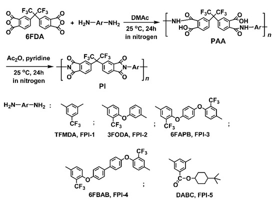 The other PI resins, including FPI-1 (6FDA-TFMDA), FPI-2 (6FDA-3FODA), FPI-3 (6FDA-6FAPB), and FPI-4 (6FDA-6FBAB) were prepared according to a similar procedure as mentioned above, except DABC was replaced by TFMDA for FPI-1, by 3FODA for FPI-2, by 6FAPB for FPI-3, and by 6FBAB for FPI-4, respectively.