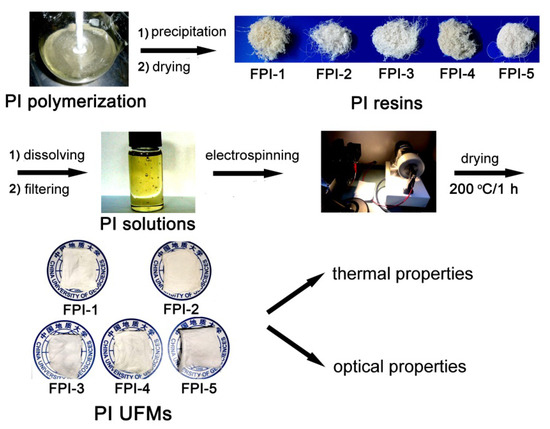 In the current work, as one of continuous efforts in developing high-performance electrospun PI UFMs for optoelectronic applications, a series of electrospun PI UFMs with high whiteness, good hydrophobic features, and good thermal stability were developed. For this target, fluoro-containing PI resins were first prepared from a fluoro-containing dianhydride, 6FDA and various diamines containing pendant trifluoromethyl (–CF3) groups, or alicyclic units in the side chains. Effects of the trifluoromethyl or alicyclic substituents on the solubility, thermal, and optical properties of the derived FPI UFMs were investigated in detail.