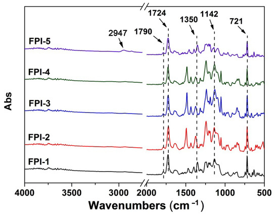 The developed FPI resins were dissolved into DMAc with the same solid content of 15 wt% to afford the FPI solutions for electrospinning fabrication, as shown in Figure 4. Flexible and tough FPI UFMs with high whiteness were all obtained according to the well-established electrospinning procedures, after being thermally dried at 200 °C for 1 h [24]. The chemical structures of FPI UFMs were confirmed by the FTIR measurements, as shown in Figure 5. The characteristic absorptions of imide rings, including those at 1790 cm−1 and 1724 cm−1, ascribed to the asymmetric and symmetric carbonyl stretching vibrations, respectively, as well as the ones at 1350 cm−1 assigned to the C–N stretching vibration, and the ones at 721 cm−1 assigned to the carbonyl bending vibration, were all clearly observed in the spectra. In addition, the characteristic absorptions of C–F bonds in trifluoromethyl or hexafluoroisopropyl units were also detected at 1142 cm−1. For FPI-5, the characteristic absorptions of the saturated C–H bonds in tert-butyl and cyclohexyl groups were detected at 2947 cm−1.