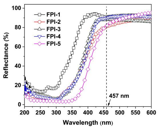 Figure S3 (Supplementary Materials) shows the micro-morphologies of fabricated FPI UFMs detected by SEM measurements, together with the statistical average fiber diameter (dav) of the UFMs shown in Table 2. It can be clearly observed that all FPI UFMs consisted of fine fibers with dav values in the range of 360–1937 nm. The varieties of dav values for PI UFMs were closely related with the Mn values of FPI resins. Resins with higher Mn values, such as FPI-3 (Mn = 2.87 × 105 g/mol) and FPI-5 (Mn = 1.02 × 105 g/mol), provided fine fibers with obviously higher dav values. For low-Mn resins, such as FPI-1 (Mn = 6.45 × 104 g/mol), thin fibers with lower dav values were obtained. Meanwhile, spindle-shaped bulges were observed in the derived fibers. In view of the effects of the fiber diameters on the optical properties of UFMs, the currently developed FPI UFMs consisted of the fibers with thin diameters might exhibit high whiteness and optical reflectance.