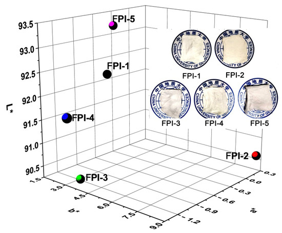 The CIE Lab color parameters of FPI UFMs were further detected and the three-dimensional plots are shown in Figure 7, together with the appearance of UFMs. The whiteness indices (WI) of FPI UFMs were calculated from the L*, a*, and b* parameters of FPI UFMs and are listed in Table 2. All FPI UFMs showed WI values higher than 80.00, which were apparently higher than that of the PI-ref (WI = 59.02). This was mainly attributed to the low CT interactions in the fluoro-contaning polymers. In addition, FPI UFMs exhibited decreasing WI values with the order of FPI-5 > FPI-1 > FPI-4 > FPI-3 > FPI-2. Interestingly, FPI-5 with the lowest optical reflectance at the wavelength of 457 nm, and the highest CT interactions, exhibited the highest WI value. This indicates that the incorporation of the non-conjugated tert-butyl-substituted cyclohexyl structure in FPI-5 efficiently reduced the absorption of the polymer in the visible light region, although it showed higher absorption in the wavelength range close to the ultraviolet region. Actually, it can be deduced from Figure 6 that, in the high-wavelength region, such as the wavelegnth of 600 nm, FPI-5 UFM showed the highest optical reflectance.