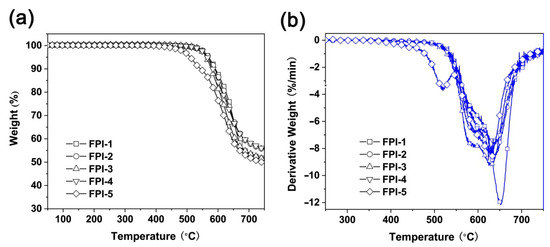 The thermal stability of the FPI UFMs was evaluated by TGA and DSC measurements, and the thermal data are summarized in Table 2. According to the TGA and derivative TGA (DTG) curves of the FPI UFMs shown in Figure 8, all UFMs showed good thermal stability before 400 °C in nitrogen. FPI UFMs exhibited a 5% weight loss temperatures (T5%) in the range of 510.5–569.6 °C and residual weight ratios higher than 50 wt% at 700 °C. All FPI UFMs showed the single-stage thermal decomposition behaviours, except that of FPI-5. For FPI-1–FPI-4 UFMs, the maximum thermal decomposition occurred in the temperature range of 630–650 °C. However, for FPI-5, a two-stage thermal decomposition was observed. The first was detected around 520 °C, which was mainly due to the thermal decomposition of the side chains. The second was found at 635 °C, which was ascribed to the main chain decomposition in the polymer.