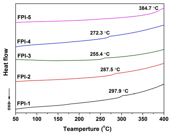 The glass transition temperatures (Tg) of the FPI UFMs were measured by DSC, and the plots are shown in Figure 9. For FPI-1–FPI-4, incorporation of the bulky hexafluoroisopropyl in the dianhydride and trifluoromethyl groups in the diamines endowed the polymers with high Tg values in the range of 255.4–297.9 °C. FPI-2–FPI-4 UFMs exhibited inferior Tg values compared to FPI-1 due to the flexible ether linkages in the molecular structures. Interestingly, FPI-5 did not show a clear glass transition during the measurement until 384.7 °C, at which point an unconspicuous heat-flow change was detected. It has been reported that the FPI derived from 6FDA and meta-phenylene diamine (mPDA) showed a Tg value of 301 °C [37]. Incorporation of the tert-butyl-substituted cyclohexyl structure via rigid ester linkage might increase the Tg of the polymer.