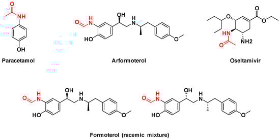 The derivatization of heteroatoms has recently gained a high degree of interest in the organic and pharmaceutical fields. Therefore, converting the starting material into a new molecule is crucial to emphasize the introduction of valuable functional groups such as pharmaceutical moieties as much as possible. Regarding this, it was found that the attachment of a formyl or acetyl group often confers biological or pharmacological properties, as they can create a more active drug or what could be termed as a pro-drug [,]. Several medicines with different therapeutical effects can be numbered among these two classes: paracetamol and other NSAIDs [] and the antiviral compound Oseltamivir [] are prominent representatives in the case of the N-acetyl group. The N-formylated compounds, on the other hand, have been less explored, probably because of their more challenging preparation []. However sporadic a chemical structure, some noteworthy drugs are available in the market, namely Formoterol [] and Arformoterol [], for pulmonary diseases and Orlistat for the treatment of obesity [] (Figure 1).