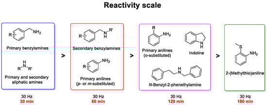 In the case of aromatic amines and secondary benzylic ones, namely compounds 2a1, 2a3–2a5, 2a9, 2a11, 2a12, 2a15, 2a16, 2a22–2a26, the reaction proceeded to a complete conversion within 1 h (Scheme 2).