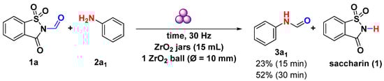 At first, we explored the mechanochemical reaction using experimental conditions close to the classical referral procedure so that a direct comparison with the solvent-based method would be possible. We performed the initial mechanochemical reactions on a mmol scale, milling aniline 2a1 (1 mmol) and N-formyl saccharin (1 mmol) inside a 15 mL ZrO2 vessel equipped with one ball (Ø = 10 mm) of the same material (Scheme 1). We ran the mechanochemical reaction at a frequency of 30 Hz for 15 min. Unfortunately, the reaction gave only a 23% yield of compound 3a1, whereas, when the reaction time was doubled (30 min), we obtained up to 52% yield of the desired product. Therefore, we investigated the influence of other parameters to achieve an almost complete conversion and avoid tedious workups. Considering the formation during the formylating process of saccharin, a relatively acidic compound, we first evaluated whether a base’s presence might avoid the supposed acid-base side-by-side reactions of amines.