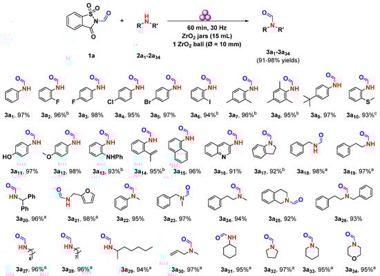 The results considerably differed as the nucleophilicity of the amine changed. Due to their enhanced nucleophilicity, both primary (aliphatic and benzylic 2a18, 2a19, 2a21, 2a27–2a29, 2a31) and secondary aliphatic amines 2a30, 2a32–2a34, only needed 30 min of reaction (Scheme 2). By contrast, the more hindered ortho-substituted anilines 2a2, 2a6, 2a7, 2a13, 2a14, and some heterocycles such as the indoline 2a17 required a longer reaction time (2 h) to reach the complete conversion. The o-methylthio aniline 2a10 required 3 h of milling to be fully converted into its corresponding formamide 3a10 (Scheme 2).