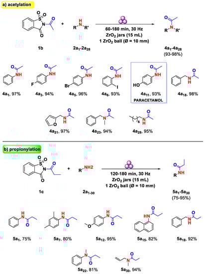 Analyzing the literature, we foresaw a significant interest in developing better formylating/acylating agents. Taking inspiration from a recent paper by Cossy and co-workers, we chose N-formylsaccharin as a suitable solid reagent for running formylation reactions in a ball mill []. In addition, N-formylsaccharin is also an inexpensive, environmentally friendly reagent and a promising candidate for the large-scale preparation of (form)amides. Furthermore, due to the outstanding relevance of this topic, we decided to expand the scope to the N-acylation reactions by examining other N-acylsaccharin compounds—namely the N-acetyl and N-propionyl derivatives. The considerable interest in such products lies in the possibility of accessing many different moieties, laying the groundwork for synthesizing anti-inflammatory drugs and analgesics, such as paracetamol-like compounds [] and fentanyl derivatives [].