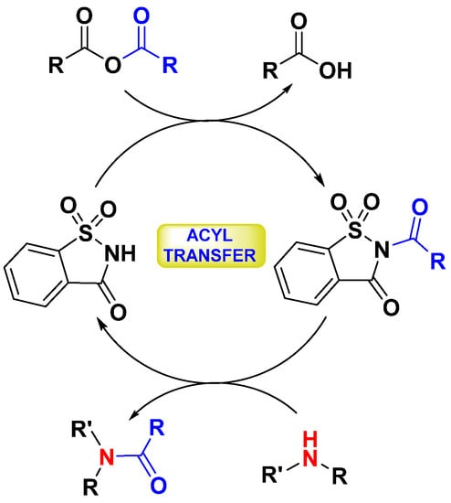 Once we explored the formylation reaction, we pursued the idea of extending the methodology to other potential acylating systems. According to the limited literature previously reported on this topic, we moved to the synthesis of N-acetyl and N-propionyl saccharin-activating agents [].