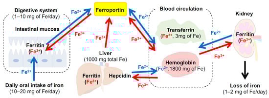 It has only been around 100 years since people started research on food in terms of “modern nutritional science” [1]. In the latter part of the 1800s, Lavoisier investigated chemical oxidation in living things, which is thought to be the beginning of nutritional science. In the early 1900s, individual food components began to be found. For example, vitamin B1 (oryzanin) was found in trials to overcome the deficiencies of military patients [2]. Vitamin E was isolated from wheat germ oil, which was found to be involved in rat reproduction [3]. In contrast, the discovery of minerals dates back to 6000 B.C, but it took centuries to recognize their roles in biological systems. Among the various minerals, iron is one of the well-known and -utilized minerals from ancient times and was estimated to be present in the blood in the 1700s [4]. Iron is the most abundant transition metal on Earth’s surface, with 3–4 g of iron in the body of a healthy adult human [5,6]. Since iron is the most abundant transition metal in the human body, its contribution toward various biological activities has long been the focus of growing attention [7]. For example, anemia is one of the major manifestations of iron deficiency. In 1925, Fontès and Thivolle found that iron-deficient horses had lower serum iron concentrations [8]. In the human body, most extracellular iron is bound to iron-binding proteins (such as transferrin and lactoferrin) [9]. Heme proteins in red blood cells play an important role in transporting oxygen to organs [10].