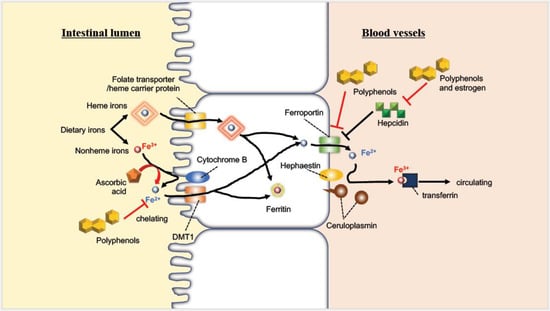 As mentioned above, iron is absorbed in the intestine as either heme or non-heme forms, but other food-derived components are also absorbed in the intestine, suggesting that interactions with them may affect iron absorption (Figure 2). For example, quercetin has been reported to inhibit intestinal iron absorption by different mechanisms, through chelation in an acute duodenal injection study and by suppressing ferroportin expression in an oral administration study in rats [41]. Tea consumption also reduces the bioavailability of iron, possibly due to polyphenols such as tannins [42,43]. It has also been reported that the intake of a high-fat diet inhibits intestinal iron absorption, causing iron deficiency [44], and that the amount of absorbed iron in overweight women was two-thirds of the normal value [45]. In contrast, ascorbic acid is well known to increase iron absorption related to iron reduction and the intake of ascorbic acid attenuates the above inhibitory effect of polyphenols [46]. The major peptide hormone, hepcidin, is also affected by flavonoids; myricetin significantly suppresses the expression of this hormone [47]. Higher concentrations and lower clearance of hepcidin due to chronic kidney disease suppress iron absorption, resulting in iron deficiency [48]. On the contrary, 17β-estradiol possibly promotes iron absorption by inhibiting hepcidin expression through an estrogen-responsive element half-site in the promoter region of the hepcidin gene [49], indicating that increased iron might be caused by another mechanism in postmenopausal women.