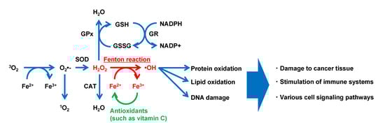On the other hand, iron is involved not only in the delivery of oxygen in our body but also in DNA synthesis and/or repair [11], indicating this mineral is essential for the survival of living things. Iron also works as a cofactor to facilitate various enzymes, such as catalase and cytochromes. The roles of iron in the body are particularly involved in redox reactions due to its preferable affinity to oxygen. In the 1890s, Henry John Horstman Fenton found the redox reaction between iron (II) and hydrogen peroxide (H2O2) to produce hydroxyl radical (OH•), called the Fenton reaction [12]. This reaction potentially occurs in the human body and is thought to regulate complicated systems, which is related to homeostasis. The products of the Fenton reaction OH• is highly reactive particles that induce oxidative damage to cells, but this is also an aspect that can be a therapeutic strategy for cancer patients. Several medicines (e.g., doxorubicin (DOX) [13], β-lapachone [14], and cisplatin [15]) include mechanisms of reaction that have applied the Fenton reaction to generate the poison, OH•, to cancer cells. Additionally, numerous food components daily consumed have beneficial effects in the human body, such as on chronic diseases and on immune systems [16,17,18]. The antioxidant reaction is one of the major properties of such food components (e.g., polyphenols and vitamins). Considering reactive oxygen species (ROS) generated by vitamin C [19] and chelating metal iron by flavonoids [20], iron potentially affects the bioactivities of absorbed and metabolized food components in the body. Furthermore, there is growing interest in programed death “ferroptosis” related to the Fenton reaction [21]. Against these backgrounds, this review summarizes the recent growing interest in the usefulness of iron and its biological relevance through basic and practical information of the Fenton reaction and recent reports.