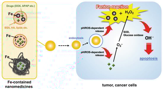 ROS are regarded to cause intracellular lipid peroxidation, leading to ferroptosis. Therefore, the Fenton reaction has been challenged for use in directly attacking cancer cells, but it is difficult to treat them because of the low amounts of generated OH• [71]. In recent years, various nanoparticles that enhance the effectiveness of Fenton reactions for drug applications (nanomedicines) have been reported. A simple scheme is depicted in Figure 4. Previous reports on such an approach have already been well reviewed by Meng et al. [72], Ranji-Burachaloo et al. [73], and Miyazawa et al. [74], so the present review focuses on very recent reports (from 2020) on nanomedicines using the Fenton reaction.
