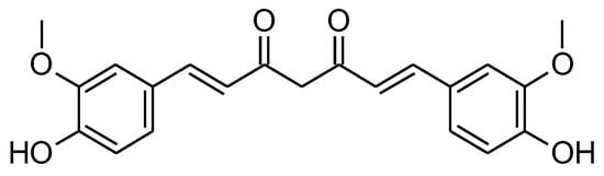 Curcumin (CUR) (diferuloylmethane) is a polyphenol that is extracted from the rhizomes of the natural plant Curcuma longa L. (turmeric) [19,20]. It was discovered for the first time in 1870, in a pure crystalline form [20] (Figure 1). Turmeric is one of the most widely used culinary spices in India and Southeast Asian nations, and is widely used in traditional Chinese herbal medicine [21]. Curcumin exerts multiple pharmacological activities including antioxidant, anti-inflammatory, antibacterial, antiviral, and anti-cancer activity. Currently, its anticancer effect has been the most researched [22]. The main challenges facing the use of turmeric are low water solubility and bioavailability [23]. Several structural changes have been made to increase its overall anticancer efficacy and improve selective toxicity against certain cancer cells [23,24].