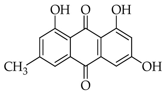 Emodin (EMD) is a natural anthraquinone derivative. Chemically it is (1,3,8-trihydroxy-6-methyl-anthraquinone) [193,194] (Figure 8). This phytochemical has been extracted from different Chinese medicinal herbs including Radix rhizoma Rhei, Aloe vera, Polygonum multiflorum, Giant knotweed, Rheum palmatum, and Polygonum cuspidatum [194,195,196]. Moreover, it can be found in the bark and roots of many other different plants, molds, and lichens [197].