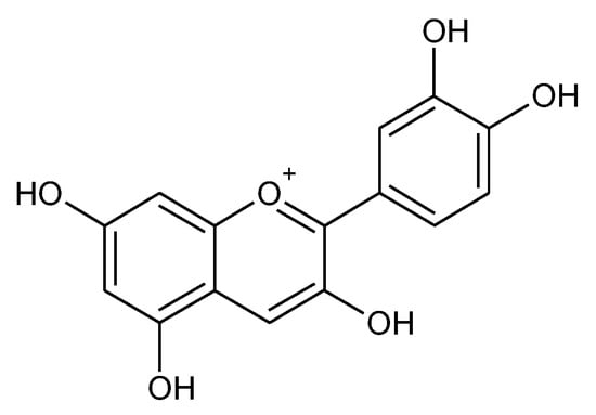 Anthocyanins (ACN) are water-soluble flavonoids seen as pigments in the dark color of fruits and vegetables such as berries, pomegranates, berries, and rice [276]. They give different colors depending on their pH, they may appear red, purple, blue, or black. Their fundamental structural part is 2-phenylchromenylium (flavylium) [277] (Figure 12).
