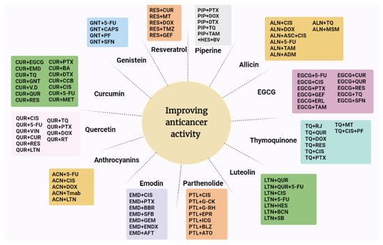 In this review, we aim to provide comprehensive data on the main effective phytochemicals and demonstrate their molecular mechanisms of action in combination with other plant-derived molecules or chemotherapy. Choosing these phytochemicals was based on their high potential anticancer activity and the extensive evaluation of their effect on improving chemotherapy outcomes.