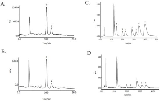 Monosaccharide chromatograms of reference substances (A) and PSDSs (B) by HPLC-ELSD; monosaccharide chromatograms of reference substances (C) and PSDSs (D) by HPLC-UV. (A,B) (1: Fru; 2: Glc); (C,D) (1: Man; 2: Rha; 3: GalA; 4: Glc; 5: Gal; 6: Ara; 7: Fuc).