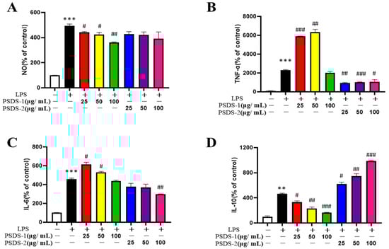 Effects of PSDSs-1 and PSDSs-2 on NO release in RAW264.7 cells (A); Effects of PSDS-1 and PSDSs-2 on (B) TNF-α production, (C) IL-6 production and (D) IL-10 production in RAW264.7 cells. ** p < 0.01, *** p < 0.001 compared with blank control group; # p < 0.05, ## p < 0.01 and ### p < 0.001 compared with LPS.