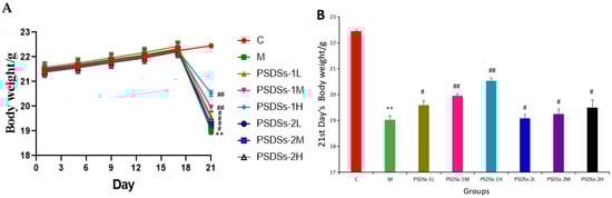 Effects of PSDSs of different Mw on the body weight of mice (A); Effects of PSDSs of different Mw on the 21st day body weight of mice (B). n = 8, x ± s. ** p < 0.01 vs. blank control group; # p < 0.05, ## p < 0.01 vs. model group.