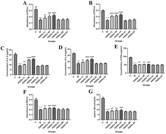 Effects of PSDSs on the proliferation of lymphocytes combined with ConA (A) or LPS (B). Effect of PSDSs on the secretion of IL-2 (C), IL-4 (D) and IFN-γ (E) induced by spleen lymphocytes in immunosuppressed mice. Effects of PSDSs on the phagocytic activity of peritoneal macrophages (F). Effects of PSDSs on splenic NK activity (G). n = 8, x ± s. **** p < 0.0001 vs. blank control group; ## p < 0.01, ### p < 0.001, #### p < 0.0001 vs. model group.
