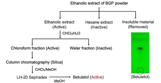 Flowchart of the isolation process for the ethanolic extract of BGP. Active chloroform fraction subjected to silica gel column chromatography eluting with chloroform/methanol gradient solvents. Fractions were further purified by repeated Sephadex LH-20 column chromatography eluting with methanol. The TLC plate was spotted at the position marked with dash circles with purified sample. A single spot was detected on TLC visualized by an UV lamp and identified as betuletol by analysis of 1H NMR spectrum. BGP, Brazilian green propolis; TLC, thin layer chromatography.