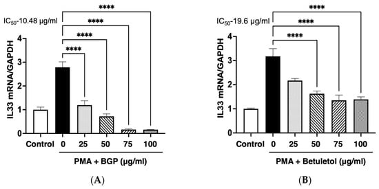 Eosinophil functions can have a significant impact on allergic inflammation. It plays an important role in the pathogenesis of chronic nasal symptoms [34]. IL-33 contributed to the manifestation of chronic allergic symptoms through an increased number of eosinophils [5]. Here, we examined the effect of BGP and betuletol on the IL-33 gene up-regulation that could be closely related to chronic symptoms of AR. We performed real-time RT-PCR with mouse IL-33 primers and a probes kit. In this experiment, the Swiss 3T3 cells were untreated/control, stimulated with PMA (100 nM), and treated with PMA+BGP (25 μg/mL, 50 μg/mL, 75 μg/mL, and 100 μg/mL) (Figure 3A) and PMA + betuletol (10 μg/mL, 20 μg/mL, 40 μg/mL, and 50 μg/mL) (Figure 3B). Results showed that both BGP and betuletol significantly suppressed PMA-induced IL-33 gene up-regulation in a concentration-dependent manner with an IC50 value of 10.48 μg/mL and 19.6 μg/mL, respectively (Figure 3).