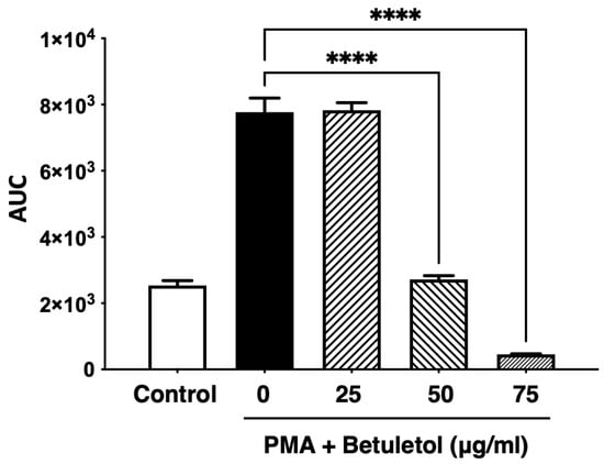We previously reported the involvement of PKCδ/MEK/ERK signaling pathway in inducing inflammatory responses [35]. In this study, to investigate the effect of betuletol in suppressing this inflammatory pathway, we performed Western blot analysis with the PMA-induced Swiss 3T3 cell lysate treated with 25 μg/mL, 50 μg/mL, and 75 μg/mL of betuletol. The immunoblot data showed inhibition of phosphorylation of ERK and calculating the band intensity, and we found that 75 μg/mL of betuletol significantly suppressed the ERK protein expression (Figure 4).