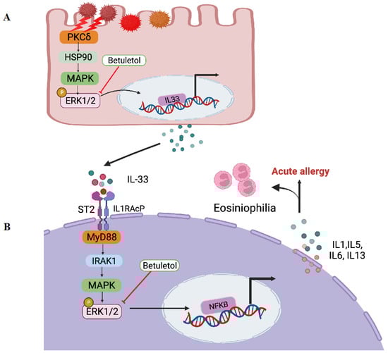 (A) Schematic diagram of IL-33 mRNA expression. Pollen/PMA stimulation of epithelial cells causes activation of PKCδ/HSP90/ERK signaling, which causes the expression of the IL-33 gene (B) schematic diagram of IL-33/ST2 signaling pathway. IL-33 is the ligand for ST2. It activates the ST2L/IL-1RAcP dimers or is neutralized by binding to sST2. The interaction of IL-33 with ST2 leads to the recruitment of MyD88, which results in the activation of MAPK-ERK and NF-κB, ultimately inducing related gene expression. Inhibition of ERK by betuletol may block the PKCδ/HSP90/ERK-mediated IL-33 mRNA expression and/or, IL-33/ST2-mediated inflammatory reactions. MyD88, myeloid differentiation primary response protein 88; MAPK, mitogen-activated protein kinase; NF-κB, the transcription factor nuclear factor-κB. Illustration created with BioRender.com.