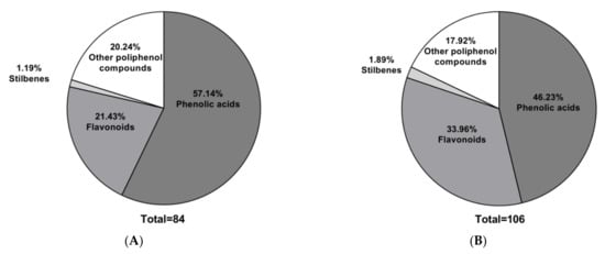 Relative distribution n of polyphenol families in MS extracts from (A) RAE, (B) HAE (unit: %).