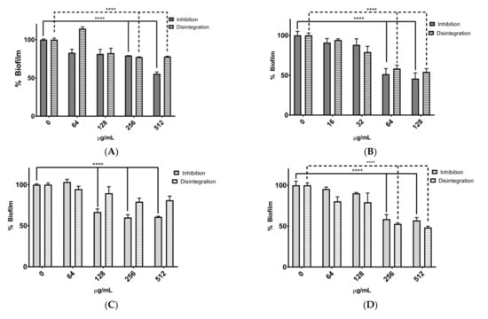 The experiment was performed as described in [89] with some modifications. A McFarland value of 0.5 was seeded in Müller Hinton Broth medium in a 96-well plate. The microorganisms were left under agitation at a stirring speed of 150 rpm and 37 °C for 24 h. Subsequently, they were treated with the concentration of MIC corresponding to the extract and three serial dilutions from MIC80, and allowed to grow for a further 48 h. The medium was removed, the bacteria were washed with 150 µL PBS twice, and the plate was allowed to dry at 60 °C for one. Then it was stained with 175 µL 0.4% crystal violet in ethanol for 15 min, washed with 180 µL PBS, and allowed to dry at 60 °C for 20 min. Subsequently, 200 µL 0.03% acetic acid was added and absorbance was measured at 570 nm in an EPOCH device. The percentage of biofilm formation was calculated from the untreated wells. The test was performed in triplicate at three different times.