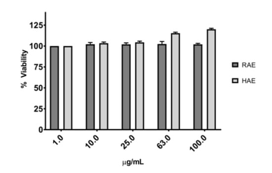 The RAE and HAE extracts tested on microorganisms showed no microbial sensitivity to either of the two extracts at the concentrations evaluated in this study, as shown in Table 6.