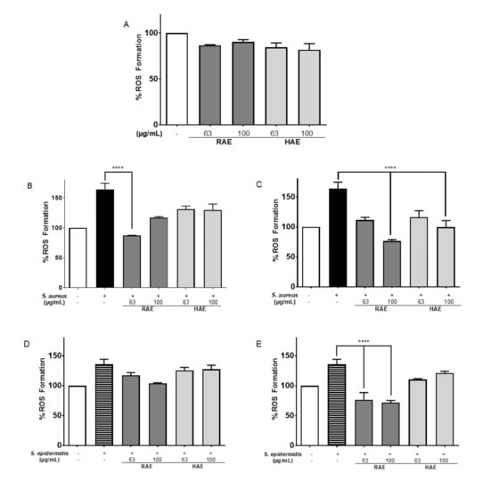 Reactive oxygen species (ROS) are a key marker of inflammation pathway and macromolecular damage. To evaluate the effect of the MS extracts on cell membrane damage and inflammation, ROS formation was measured generating damage using an MOI of 5 S. aureus or S. epidermidis using the H2DCFDA-DCF probe. To this end, the HDFa cell line was incubated with MS for 3 h (Figure 5A). It was determined that the extracts tended to slightly reduce normal ROS levels. When HDFa cells were simultaneity exposed to S. aureus and MS extracts for 3 h of incubation, a significant reduction in intracellular ROS formation was observed compared to ROS generated in the presence of S. aureus without the extracts (Figure 5B). Cells treated with 63 µg/mL RAE generated 76.88% ROS. However, when HDFa cells were preincubated with the extracts for 3 h and then infected with S. aureus or S. epidermidis and incubated for an additional 3 h, the extracts also reduced ROS formation. The best result was obtained with 100 µg/mL RAE extract compared to 63 µg/mL RAE extract, with the HAE extract at the same concentrations (Figure 5B).