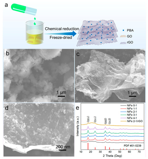 (a) Schematic illustration of preparation process; (b) SEM images of PBA NiFe 2-1; (c,d) SEM images or PBA NiFe 2-1/rGO at various magnification; (e) XRD patterns of the as obtained PBA samples.