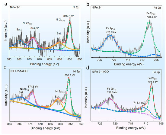 To clarify the chemical bonding of the materials, PBA NiFe 2-1 and PBA NiFe 2-1/rGO were characterized by XPS. The C 1s peak at 284.6 eV was considered a standard for sample charging. The survey spectra of these two samples before OER measurement are shown in Figure S3. To estimate the Ni and Fe species contents, the obtained XPS results were fitted by XPS PEAK software (Figure 2). Two major peaks were found by split-peak fitting located at 855.7 eV for the Ni2p3/2 peak and Ni2p1/2 at 874.0 eV corresponding to the Ni-N coordination in NiN6 [19], and the other two peaks (860.62 and 880.09 eV) are the satellite peaks corresponding to the aforementioned two peaks (Figure 2a) [33]. Comparing the Ni 2p high-resolution peak, the Ni 2p 3/2 and 2p 1/2 peak positions are shifted to higher energy for the graphene composite compared with PBA NiFe 2-1, indicating that the interaction between Ni and rGO results in a decreased electron density for Ni and increased the oxidation state of Ni (Figure 2c) [34,35]. The high oxidation state of Ni is favorable for receiving electrons, which contributes to the formation of NiOOH active material, and can increase the charge transfer between the electrode material and the electrolyte [19,36].