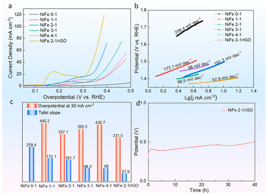 Electrochemical measurement of PBA materials. (a) LSV curves; (b) linearly fitted Tafel slope; (c) histogram of overpotential and Tafel slope values; (d) the durability of PBA NiFe 2-1/rGO composite at the current density of 30 mA cm−2.