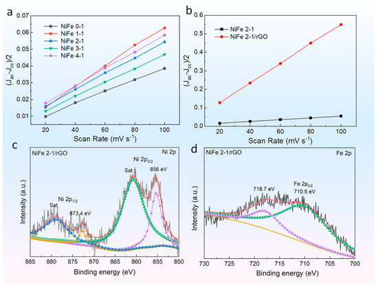 The linearly fitted Cdl results of electrodes. (a) PBA NiFe x-1; (b) PBA NiFe 2-1 and PBA NiFe 2-1/rGO electrodes; (c,d) XPS spectra of samples after OER measurement. High-resolution Ni 2p and Fe 2p spectra of PBA NiFe 2-1/rGO, respectively.