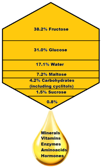 The chemical composition of honey confirms that it is a very complex matrix. It can be evidenced by over 300 components determined in different types of honey belonging to various chemical groups of compounds. The composition of honey depends on many factors, such as climatic (insolation, humidity) and environmental conditions, available plants, a botanical and geographical origin, welfare of bees and many others. It is difficult to find honey characterized by the same qualitative and quantitative compositions, even within the same variety [1,2,3,4,5]. Nevertheless, honey is an infused solution of sugars in water. In addition, it also includes other valuable contaminants, such as proteins, vitamins, minerals, enzymes (invertase, lactase, α- and β-amylase, glucose oxidase, catalase and phosphatase), flavoring compounds, free amino acids, organic acids (lactic, malic, malic, formic, citric, acetic, butyric, p-amino-benzoic, pyroglutamic and gluconic) and volatiles organic compounds [5,6,7,8,9]. According to the data available in references [1,2,3,4,5], the approximate percentage composition of honey related to its physicochemical properties has been presented in Figure 1.