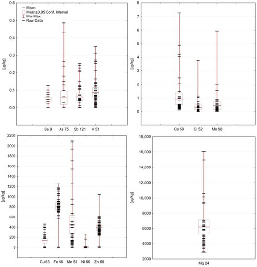 The overall content of PTEs in investigated honey samples is presented in Table 2, then in Figure 3, variability plots of PTEs content in honey samples are shown. None of the samples contain cadmium and lead in levels exceeding BEC; therefore, those two elements were excluded from further evaluations. Most of the PTEs (excluding Fe and Zn) have right-skewed distribution, suggesting that the majority of results is below mean value. Arsenic was found in 10 out of 45 samples with highest content (0.49 μg/kg) in polyfloral honey from Turkey and linden honey from Warmian-Masurian Voivodship. Two samples of honeydew honey from Lesser Poland Voivodeship contain elevated content of nickel (>400 μg/kg), which can be related to Ni ore mining activities in that region. In contrast, two other samples from the Warmian-Masurian district contain the highest amount of chromium (3.76 μg/kg) in the case of buckwheat honey and molybdenum (5.94 μg/kg) in the case of dandelion honey.