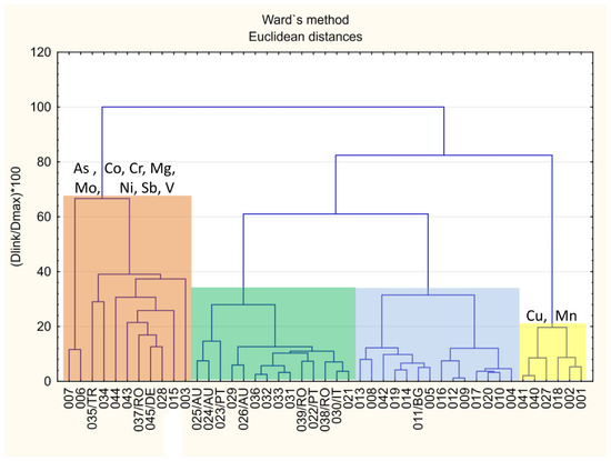 First one (marked with yellow) contains honey with the highest content of copper and manganese with mean value of 367 µg/kg (0.367 mg/kg) and 1172 µg/kg (1.172 mg/kg), respectively. On the opposite side of dendrogram, CA creates cluster containing 11 samples of honey with elevated content of arsenic, cobalt, chromium, magnesium, molybdenum, nickel, antimony and vanadium. Honey from some countries other than Poland were grouped in a cluster marked in green (12 out 18 samples). Both clusters located in the middle of the tree graph (indicated by green and blue colors) were characterized by moderate values of analyzed PTEs.