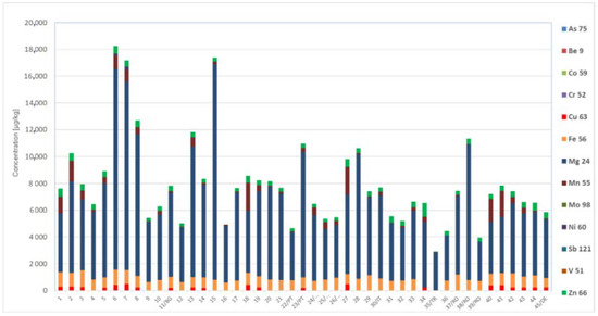 Due to the consumption of honey by people around the world, the content of mineral salts, and thus the presence of bioelements in honey, was also important in this study. Based on the information available about the composition of the honey, this natural product contains, in most cases, potassium (up to 500 mg/kg), phosphorus, magnesium and calcium. However, iron, silicon, sulfur, copper, fluoride, zinc and manganese occur in slightly smaller quantities. Moreover, honey contains other important bioelements, such as cobalt, molybdenum, chromium and iodine. The varieties of honey differ, as do the number and content of bioelements, where the average is usually 0.3%, in nectar-type honey it is in the range from 0.01 to 0.035% and in honeydew honey it is approximately 1% [3,5,9]. The content of these metals, which are considered as bioelements, such as magnesium, iron, copper, zinc, manganese, cobalt, molybdenum and chromium, have been highlighted. The results of the comparative analysis are presented in Figure 5.
