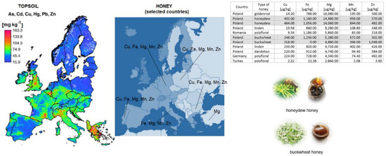 Figure 6. Exemplary results of macro- and microelements concentration in honey samples and maps of heavy metal concentrations in topsoil in Europe, partially according to [33]. Reprinted/adapted with permission from Ref. [33].