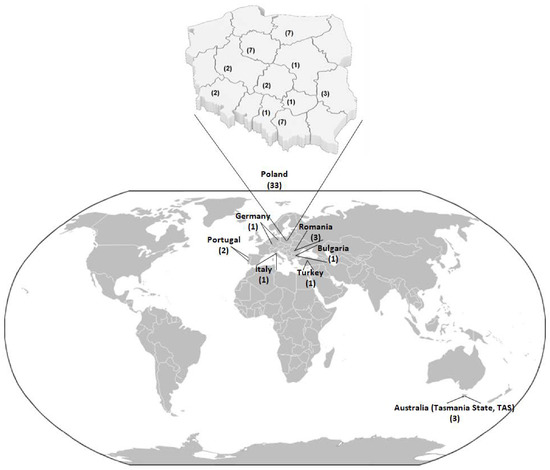 Figure 7. Map of distribution of honey samples in Poland and other countries of the world, including the number of samples.