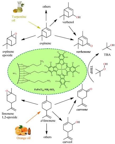 - Becerra, J.-A.; González, L.-M.; Villa, A.-L. Kinetic Study of α-Pinene Allylic Oxidation over FePcCl16-NH2-SiO2 Catalyst. J. Mol. Catal. A 2016, 423, 12–21. [Google Scholar] [CrossRef]