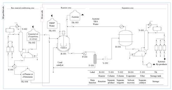 This zone includes the units required to carry out the conditioning of all the raw materials essential for the proposed processes. No further purification of the fresh input of solvent acetone is required since it is marketed with high purity. Although the use of dehydrated TBHP would be of great advantage, the purification of commercial aqueous solution is not considered in the process because of its unstable formulation resulting after higher purification [28]. The FePcCl16-NH2-SiO2 catalyst is obtained by the synthesis procedure reported in the literature [29,30]. Commercial turpentine and orange essential oils with no additional purification are used in the SI-raw-oils scenario of the process. However, the purification of α-pinene and d-limonene by fractional vacuum distillation in T-102 from the essential oils is proposed in the SII-purified-oils scenario based on a technical and economic feasibility analysis developed in previous studies [31].