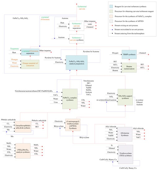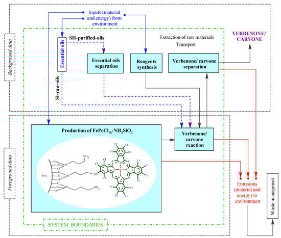 All data required for the LCI were obtained combining both secondary (background data) and primary (adjusted foreground data) sources (Figure 3). This is because this study is focused on an original conceptual process design to produce verbenone and carvone, and due to the absence of information on the implementation of the process at the industry level. The foreground data were obtained from laboratory scale experiments related to catalyst and product preparation in the reactor and adjusted to the scale of the process shown in Figure 2 by process simulation. The secondary data were obtained by computational simulation of mathematical models of the equipment in the process using Aspen Plus and Matlab software, from global LCI datasets such as Ecoinvent and Agrifootprint, and from patents and articles. For the implementation of the LCI in the SimaPro software, some additional processes were implemented since there was no available information in the selected databases (see Table S1 in Supplementary Materials). The additional processes were based on either patented or reported information covering the production of orange essential oil [34] and the synthesis of several reagents such as t-butyl hydroperoxide [35,36], (3-aminopropyl)triethoxysilane [37], allylamine [38], ammonium heptamolybdate [39], tetrachlorophthalic anhydride [40], triethoxysilane [41], and FePcCl16-NH2-SiO2 catalyst by the chemical routes shown in the Supplementary Materials section in Figure S2. The available data of raw materials emission and extraction were obtained from the Agri-footprint 5.0—mass allocation and the Ecoinvent 3.8—allocation, cut-off by classification databases (Table S2). The LCI is structured in the process block diagram shown in Figure 4 with a detailed description in the Supplementary Materials (Section S1. Details of the life cycle inventory).