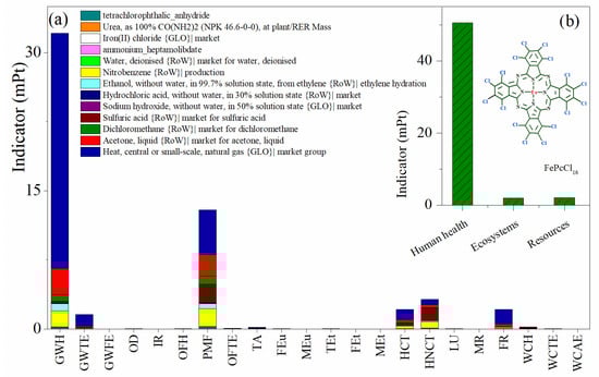 Environmental impact assessment by weighting indicators in the production of FePcCl16. (a) Impact categories by process contribution and (b) damage categories. Assessment method: ReCiPe 2016 Endpoint (H) V1.06/World (2010) H/A; mPt: milipoints.