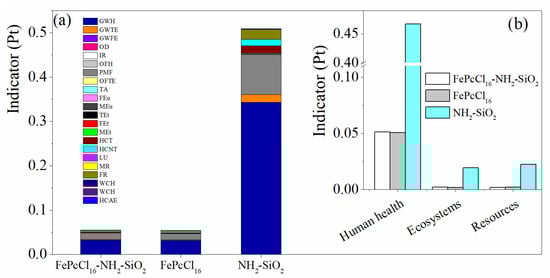 Comparison of the environmental impacts assessment by weighting indicators in the production of the catalyst FePcCl16-NH2-SiO2, support and active phase. (a) Impact categories by single score and (b) damage categories. Assessment method: ReCiPe 2016 Endpoint (H) V1.06/World (2010) H/A; Pt: points.