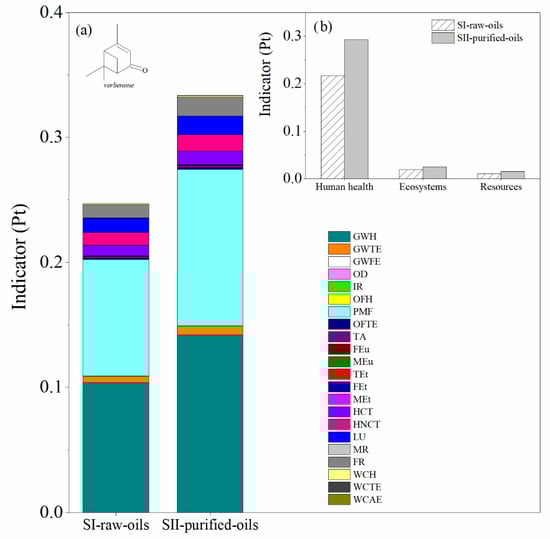Comparison of the environmental impacts in the SI-raw-oils and SII-purified-oils scenarios for the verbenone process production. (a) Impact categories and (b) damage categories. Assessment method: ReCiPe 2016 Endpoint (H) V1.04/World (2010) H/A.